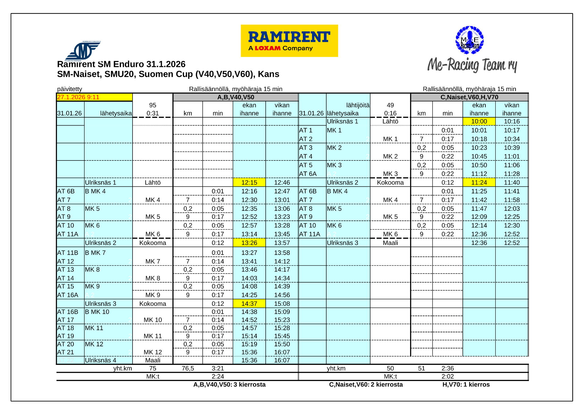 Aikatauluun ja kierrosmääriin voidaan tehdä muutoksia kilpailjamäärän ja sääolosuhteiden mukaan.